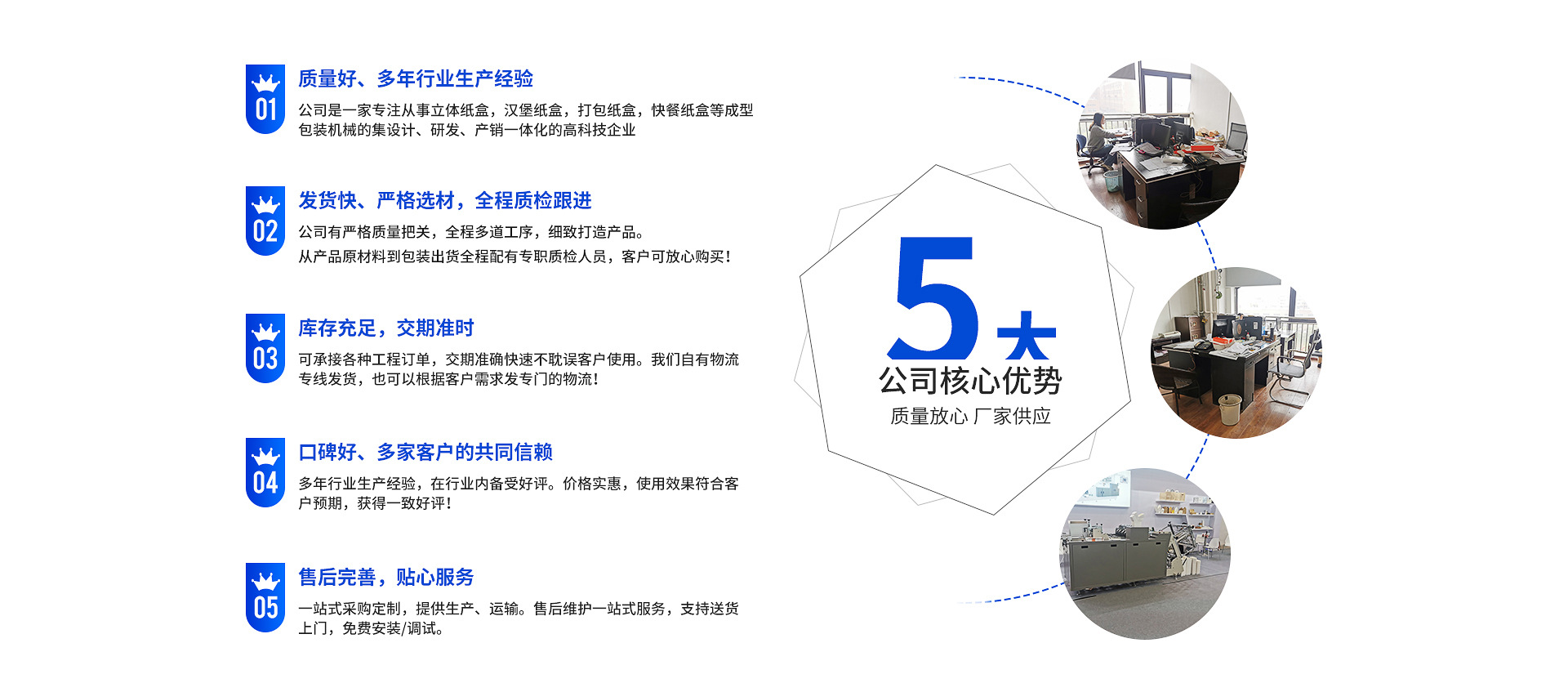 瑞安市中法機械有限公司是一家從事立體紙盒機,漢堡紙盒機,打包紙盒機,快餐紙盒機等成型包裝機械的設(shè)計、研發(fā)、產(chǎn)銷一體化的高科技企業(yè)。公司有現(xiàn)代化的管理體系和完善的售后服務(wù)體系;有一支具有充滿青春活力的精銳研發(fā)團隊!自成立以來,中法公司堅守“誠信、學習、發(fā)展”的企業(yè)發(fā)展理念,堅持“以誠信為道、以質(zhì)優(yōu)取勝”的經(jīng)營原則,在市場競爭中取得了良好的社會和經(jīng)濟效益!